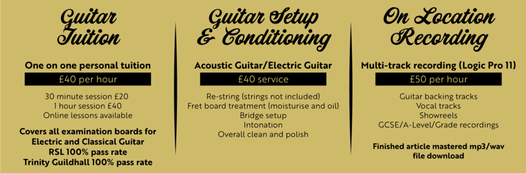 Offering a comprehensive range of services including professional guitar tuition, expert guitar maintenance and on-location studio recording for backing tracks, showreels and portfolios.